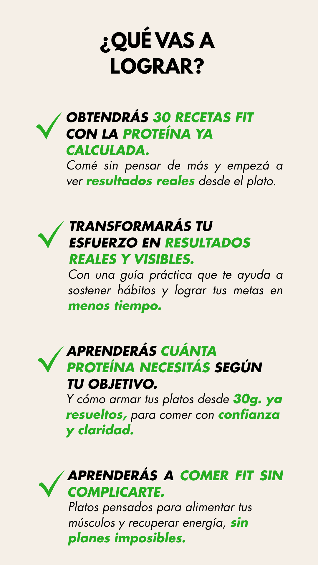 Porque fue diseñado especialmente para personas que entrenan, con recetas accesibles, ricas y rápidas que aseguran la proteína que tus músculos necesitan después del gym. ⭐
