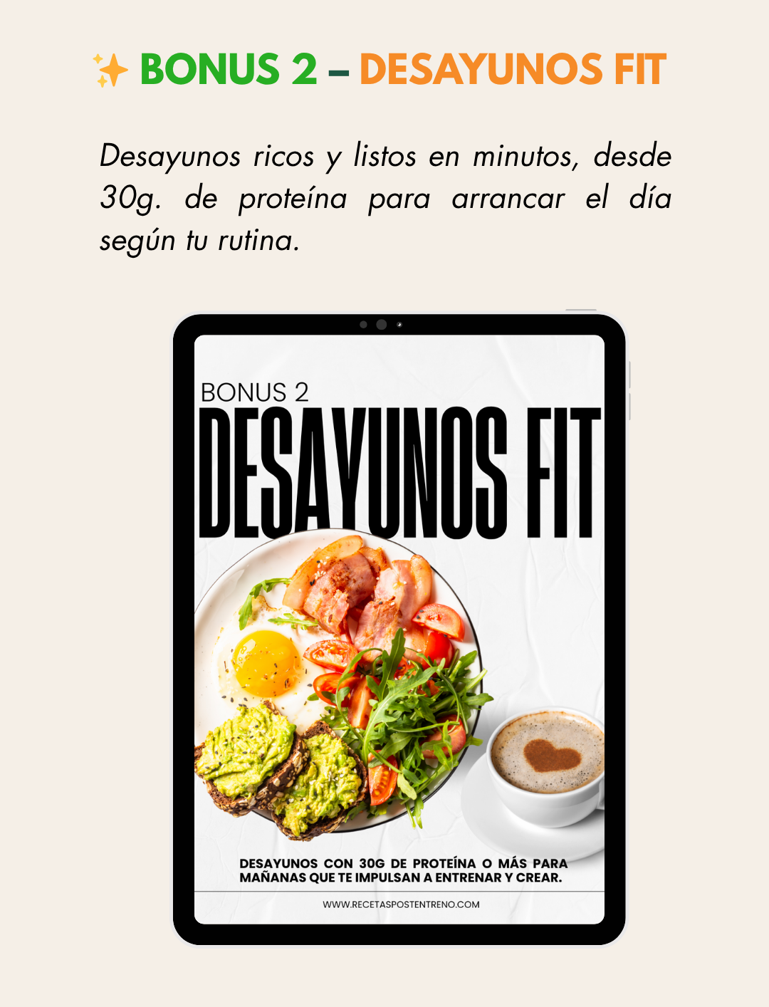🌞 Desayunos Fit – recetas proteicas y rápidas para arrancar el día con energía, ideales para acompañarte en tu rutina.